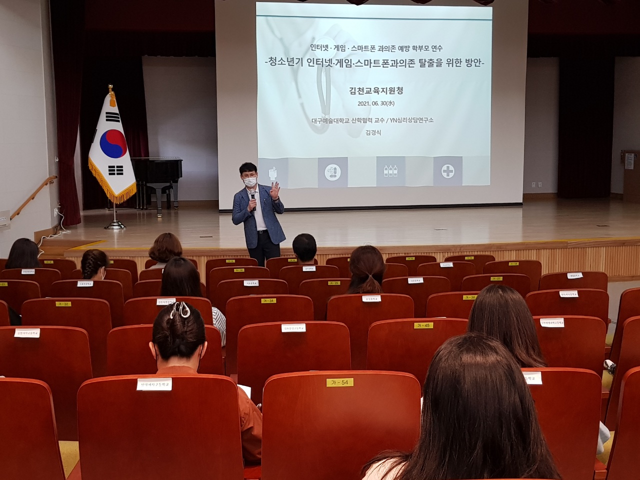 | 경상북도김천교육지원청(교육장 박삼봉)은 6월 30일 학생문화예술센터에서 2021학년도 인터넷·게임·스마트폰 과의존 예방을 위한 학부모 및 교원 역량강화 연수를 실시하였다. 이번 연수는 코로나의 영향으로 초,중,고 학부모는 오전에 교사는 오후로 2차례 나눠 진행을 하였다.