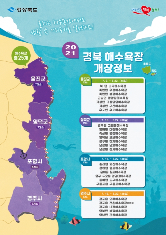 도내 24곳 해수욕장 가운데 포항의 6곳이 7월 9일, 경주·영덕·울진 18곳이 7월 16일부터 문을 열기로 했다.