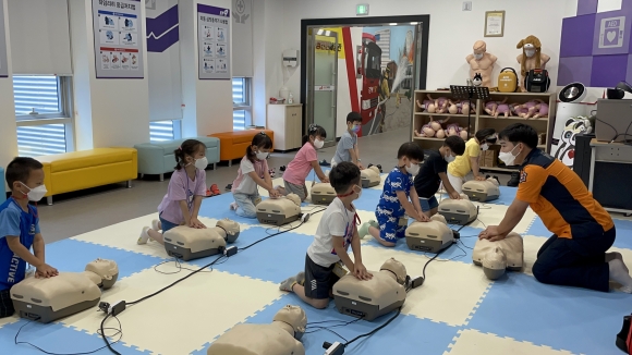 김천소방서 소방안전체험관은 유아들이 상황에 따라 안전체험을 할 수 있도록 마련되어 있었다. 심폐소생술, 지진체험, 화재 진압, 연기대피, 승강기 비상 행동요령, 전기감전 안전교육 등 재난과 안전사고를 직접 체험하였다. 유아들은 실제와 비슷한 교육에 진지하게 참여하는 모습을 보였다.