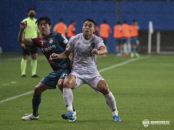 전반 17분 정재희의 패스에서 비롯된 공격 찬스는 문전 박동진에게 연결되지 않으며 무산됐다. 이어 전반 18분, 김천에게 페널티 킥 찬스가 찾아 왔지만 VAR 온필드 리뷰를 거쳐 취소되며 아쉬움을 삼켰다. 폭우 속에 진행된 전반전에서 양 팀은 상대의 골문을 노리며 계속해서 공격을 이어갔지만 소득 없이 0대 0으로 전반을 마쳤다.