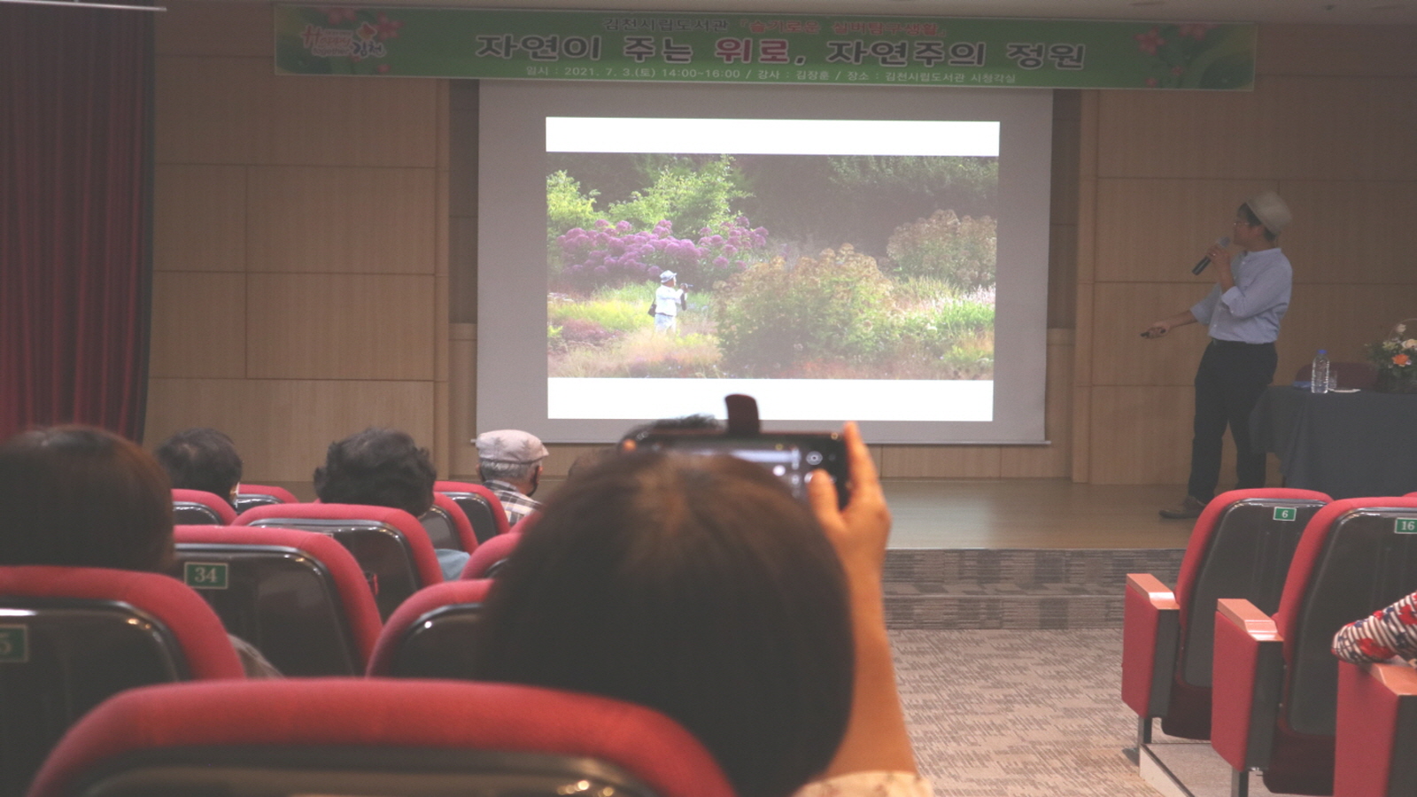 최근 코로나 발생 이후로 정원 가꾸기, 정원 문화에 대한 관심이 점점 높아지고 있고, 자연과 인간이 행복하게 공존할 수 있다는 가능성과 근거를 제시해준다는 점에서 정원은 코로나 시대에 새로운 시각과 희망적인 대안이 되고 있다. 김장훈 정원사는 생태정원에서 출발해 최근 주목받고 있는 자연주의 정원의 조성 기술과 그 원리를 설명하고, 자연과 함께 하는 정원, 자연스러운 식물 배열, 화려한 꽃보다는 식물의 형태 중시, 각기 다른 생명과 공생하는 가드닝을 자연주의 정원의 특징으로 꼽았다. 백선주 김천시립도서관장은 “자연주의 정원 강연을 통해서 일상 속에서 잠시 잊었던 자연의 소중함과 위대함을 다시 한 번 깨닫고, 교감과 힐링을 통해 우리의 생활공간과 마음이 보다 싱그럽고 화사해지는 시간이 되셨길 바란다.”고 전했다.