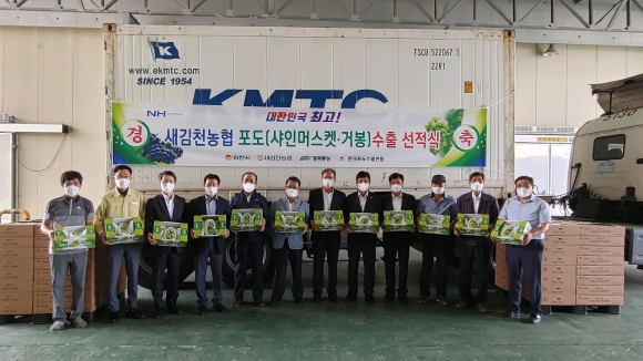 | 김천시(시장 김충섭)는 지난 1일 새김천농협에서 수출농가와 수출업체 등 10여명이 참석한 가운데 올해 수확한 포도를 처음으로 수출하는 수출 선적식을 가졌다.