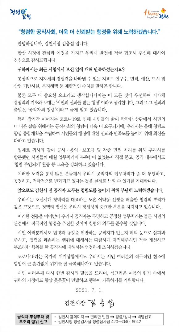 김천시(시장 김충섭)는 지난 7일 청렴도 향상을 위한 시의 노력을 알리고 시민들의 협조를 구하기 위한 ‘청렴 서한문’을 발송했다.