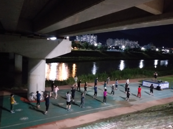 매주 월~금 저녁시간(20:00~21:00) 시민 누구나 시원한 야외 강변공원으로 나오셔서 실시간 전문강사의 지도에 따라 몸풀기, 맨손체조, 근력운동, 마무리 스트레칭 순으로 신명나는 음악과 함께 하다보면 지쳐있던 몸과 마음은 훨씬 가벼워질 것입니다.
