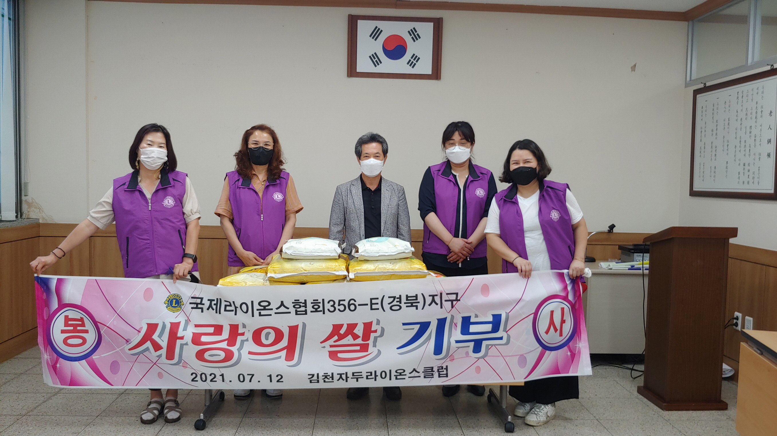 | 김천자두라이온스클럽(회장 최선이)에서 김천시노인지회(지회장 이부화)에 코로나19로 지쳐 있는 독거.복지사각지대 어르신중 생계가 곤란한 어르신에게 끼니를 러지 않고 식사를 하실 수 있도록 사랑의 쌀 10kg 12포대 를 후원 해 주었다. 최선이 회장은 지역사회를 위한 봉사와 불우한 사람을 돕는 것을 목적으로 된 라이온스의 취지를 적극실천하는 클럽으로 이끌어 오면서 평소 노인 취약계층에게 관심을 두고 사랑의 쌀 나눔 사업을 펼치고 있어 시민들에게 큰 감동을 주고 있고 힘들고 어렵게 살아가고 있는 노인들에게 위로가 되고 있다.