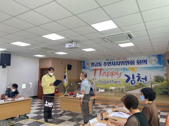 양금동 주민자치위원회 월례회의는 코로나 19의 확산으로 4월 이후 중단되었다가 오랜만에 대면으로 진행되었다. 이번 회의에서는 7월에 새로 양금동장으로 임명된 박재영 동장도 참여하여 위원들과 첫 만남을 가졌으며, 신규 주민자치위원의 위촉식도 있었다.