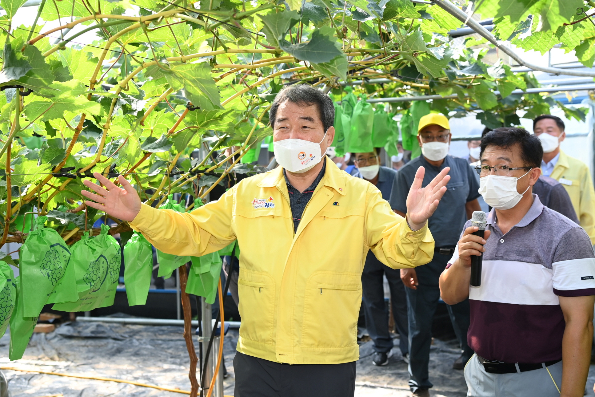 | 김충섭 김천시장은 지난 13일 현장 소통의 일환으로 포도 재배시 노동력 절감을 위한 무인방제기 시연 및 자두 재배 생력화를 위한 Y자 시설 재배 농가를 방문 하였다.
