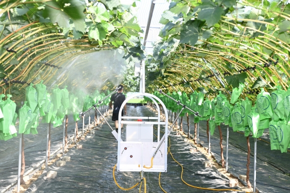 이번에 시연한 무인방제기는 김천시농업기술센터의 기술자문을 통해 관내업체에서 개발하였으며 레일 착·탈식으로 리모콘으로 간단한 조작이 가능하여 사용이 용이 하고 센서를 통해 작업자 추종 및 호출이 가능 하다. 또한 단순히 약제 방제뿐만 아니라 농자재 운반 및 비료 살포 등도 가능하게 설계 되어 다목적 이용이 가능하다.