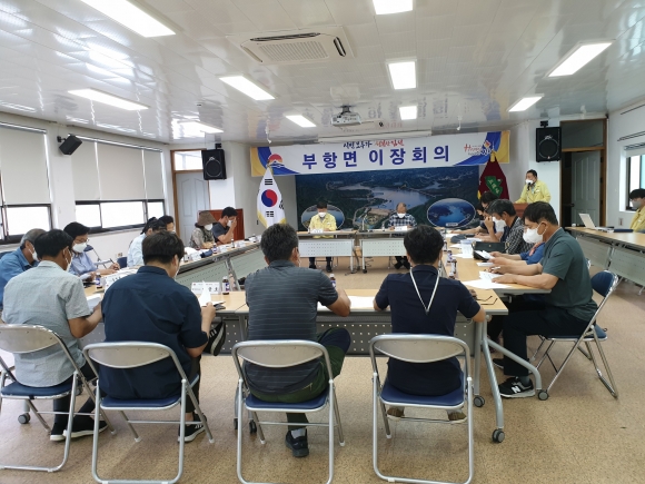 | 김천시 부항면에서는 7월 13일 면사무소에서 이장회의를 개최하였다. 코로나19 확산 방지를 위해 손소독 및 마스크 착용 하여 방역수칙을 준수하여 진행했다. 이 날 회의에는 이명기 시의원과 이동형 경제관광국 국장, 정태희 대산농협조합장, 김광순 대산농협부항지점장이 참여했다.