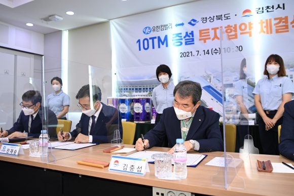 | 김천시와 경상북도는 7월 14일 유한킴벌리(주) 김천공장 국제회의실에서 김충섭 김천시장, 하대성 경북도 경제부지사와 유한킴벌리(주) 진재승 대표, 이우청 김천시의회 의장 등 20여명이 참석한 가운데 년 36,000톤 규모의 프리미엄 화장지 생산공장 증설을 위한 투자양해각서를 체결했다.