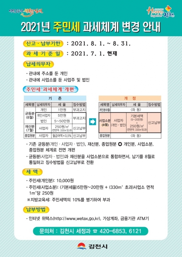 이번 주민세 과세체계는 기존 균등분(개인․사업자․법인), 재산분, 종업원분을 개인분, 사업소분, 종업원분으로 세목을 단순화하고 舊 균등분(사업자․법인분)과 舊 재산분을 사업소분으로 통합하면서, 납기를 8월로 통일하고 징수방법을 신고납부로 전환했다.