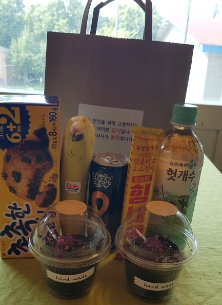 이날 전달된 간식은 제과제빵 재능봉사를 하고 있는 ‘빵을 사랑하는 사람들의 모임(이하 빵사모)’이 직접 만든 컵케잌과 ‘출동!무조건재난지킴이봉사단’이 준비한 음료 등 간식거리를 정성스럽게 담아 100인분을 준비하였다.