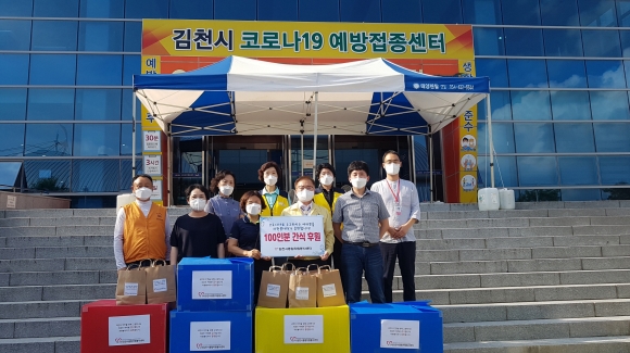 | 김천시종합자원봉사센터(윤남선 센터장)는 14일 김천시 코로나19 예방접종센터를 방문해 코로나19 극복에 애쓰고 있는 의료진과 관계자들에게 간식을 전달하고 응원과 감사의 마음을 전했다.