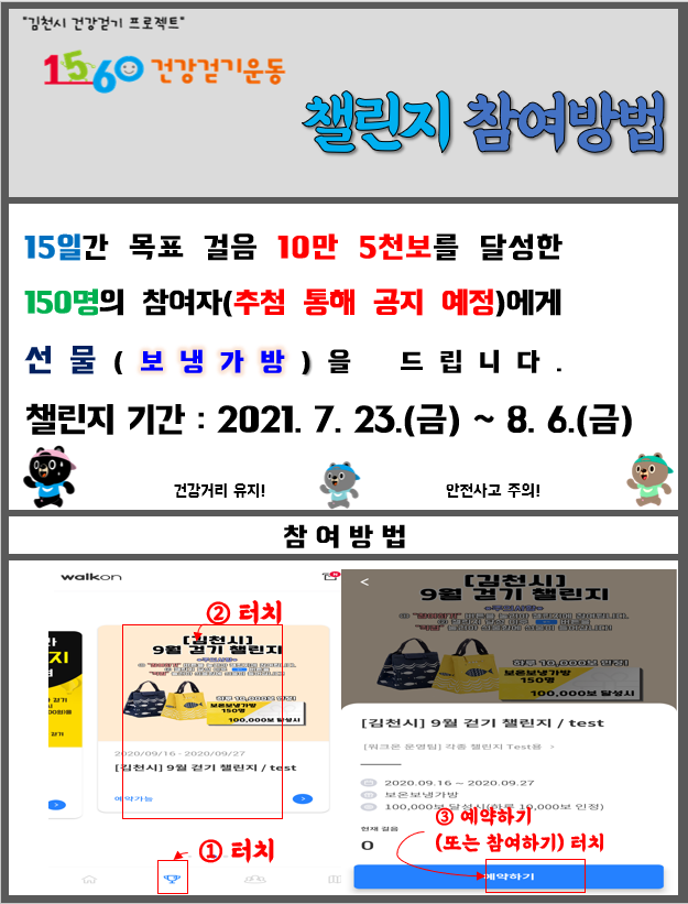 챌린지 참여를 위해서는 스마트폰 플레이스토어 또는 앱스토어에서 ‘워크온’ 설치 후 김천시 공식 커뮤니티(소 그룹 읍면동 선택) 가입, 김천시 챌린지에서 ‘참여하기’를 누른 후 휴대폰을 소지하고 걸으면 된다. 챌린지 기간 동안 목표 걸음 수 10만 5천보를 채우게 되면 자동 응모 되며 당첨자는 추첨을 통하여 8월 중 워크온 앱 내 공지사항에 게시될 예정이다.