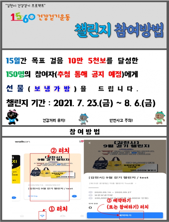 이번 7월 챌린지는 7월 23일부터 8월 6일까지 목표걸음 10만 5천 보 이상(1일 최대 7천 보 인정) 달성자 중 추첨을 통해 150명을 선정, 기념품을 증정할 예정이다.