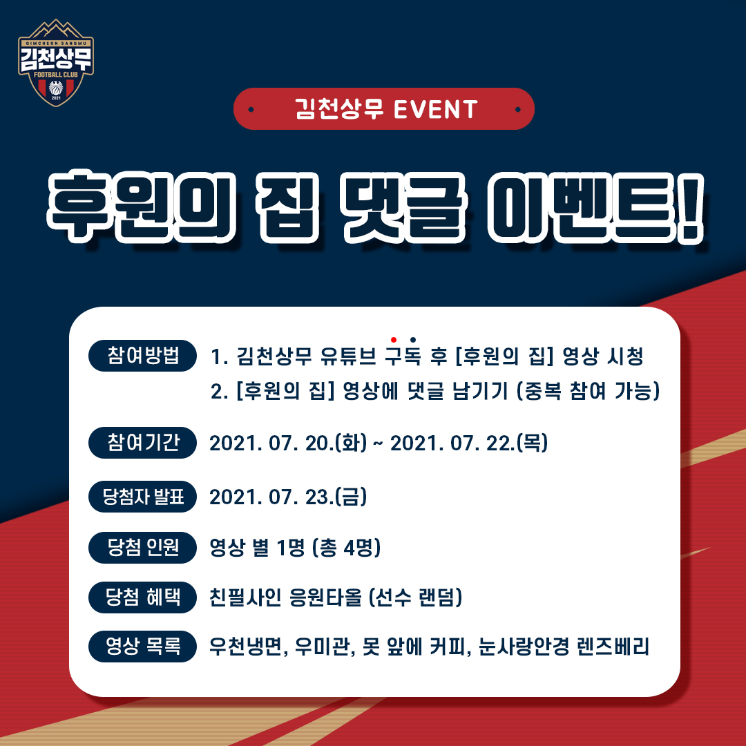 김천상무프로축구단(대표이사 배낙호)이 20일부터 22일까지 유튜브를 통해 후원의 집 댓글 이벤트를 실시한다. 김천상무 유튜브 구독 후 후원의 집 영상을 시청하고 댓글을 남기면 참여 완료다. 영상은 총 4편으로 1편 우천냉면, 2편 우미관, 3편 못앞에 커피, 4편 눈사랑 안경 렌즈베리 김천점이다.