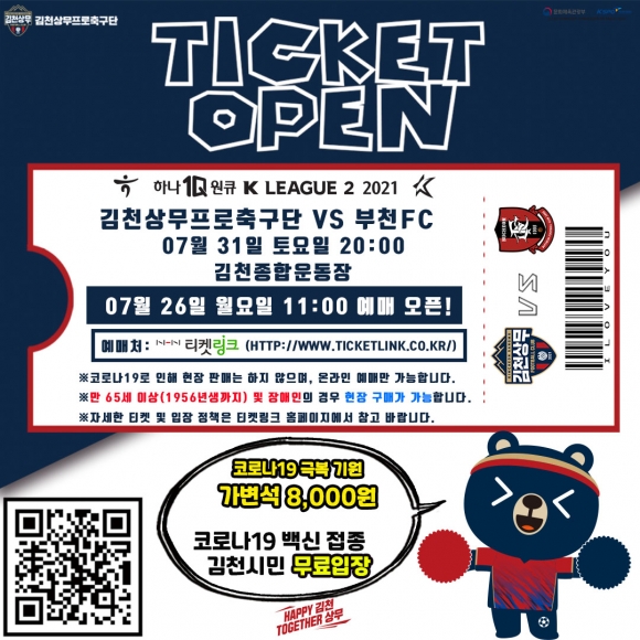 김천상무프로축구단(대표이사 배낙호)이 26일 오전 11시, 온라인 예매 사이트 티켓링크를 통해 31일 오후 8시 김천종합운동장에서 열리는 ‘하나원큐 K리그2 2021’ 23R 부천FC와 홈경기 온라인 예매를 시작했다.