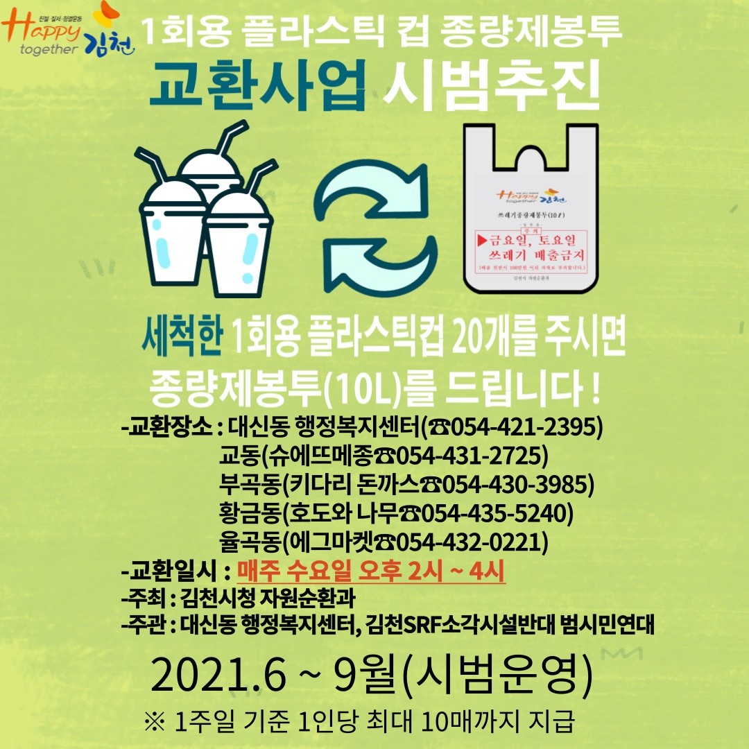 1회용 플라스틱 컵 종량제봉투 교환사업은 현재 시범사업으로 진행 중이며, 2021년 6월부터 9월까지 시행될 예정이다. 세척한 1회용 플라스틱 컵 20개를 정해진 시간에 제출하면 종량제봉투 10L와 교환할 수 있는데, 교환장소는 대신동행정복지센터, 슈에뜨메종, 부곡동 키다리돈까스, 황금동 호두와 나무 등이다.