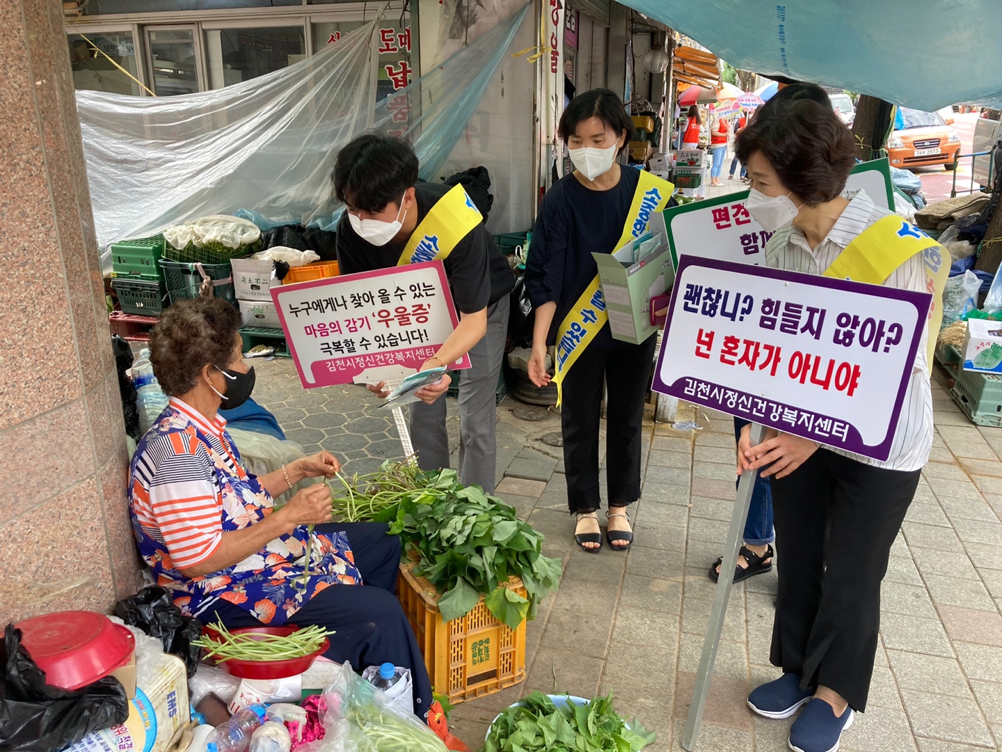 | 김천시(시장 김충섭)는 지역주민의 정신건강 서비스 접근성 향상을 위해 8월 9일 황금시장 내 상가 주민들을 대상으로 심리지원 서비스 마음톡톡 사업 및 캠페인을 실시했다고 밝혔다.