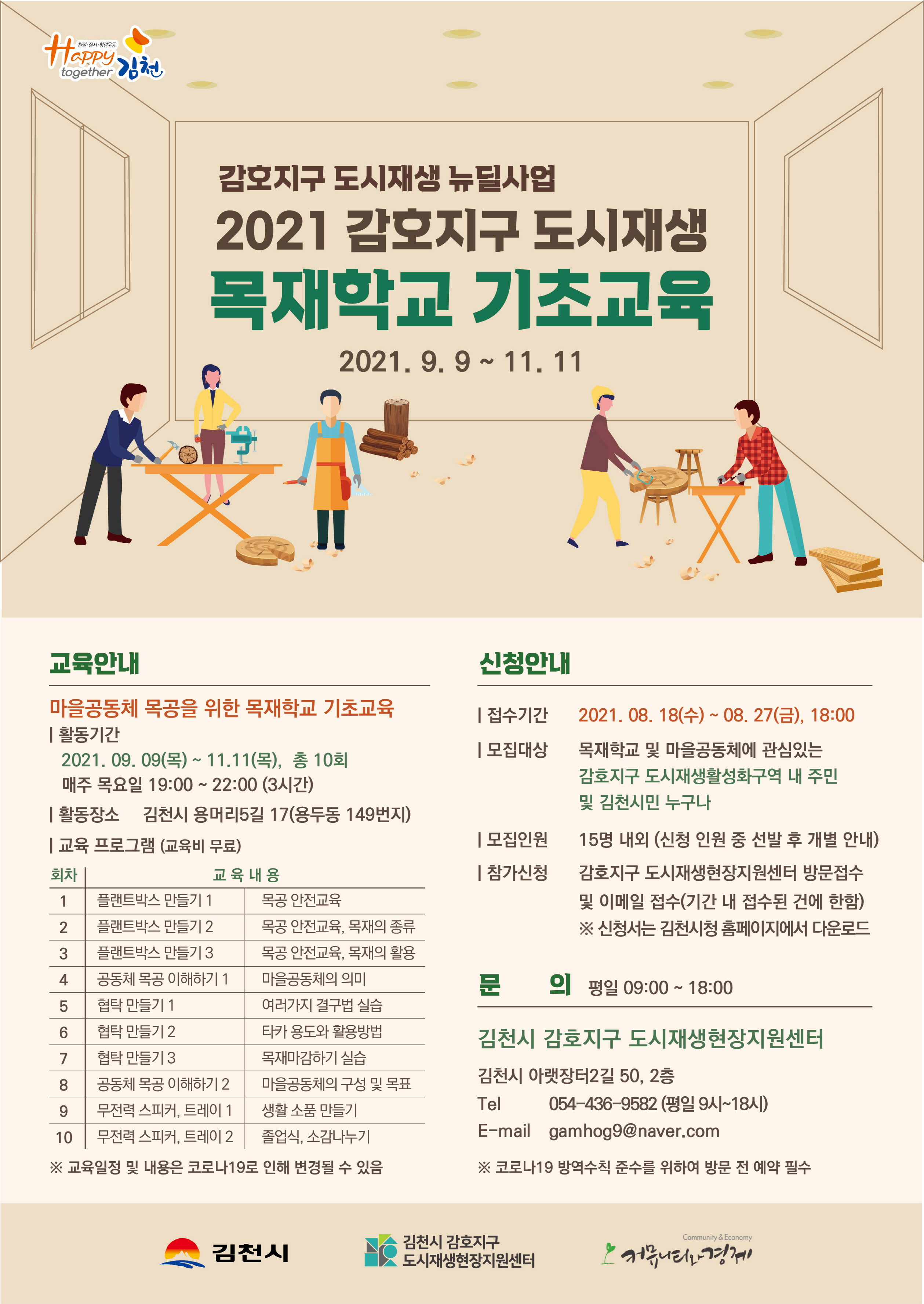 이번 목재교육은 감호지구의 창업 및 사회적경제조직을 설립하기 위한 교육의 일환으로 감호지구 마을공동체 목공 조직양성을 위한 이론교육과 가구 및 소품 제작 등 실습 위주의 기초교육 프로그램으로 9월 9일부터 11월 11일까지 매주 목요일 총 10주간 진행될 예정이다.