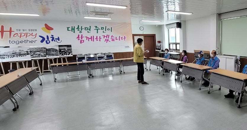 | 김천시 대항면행정복지센터(면장 김훈동)에서는 19일 노인일자리 참여자 5명을 대상으로 복지센터 내 2층 회의실에서 교통안전교육 및 장애인 인식개선 등에 대한 교육을 실시하였다.