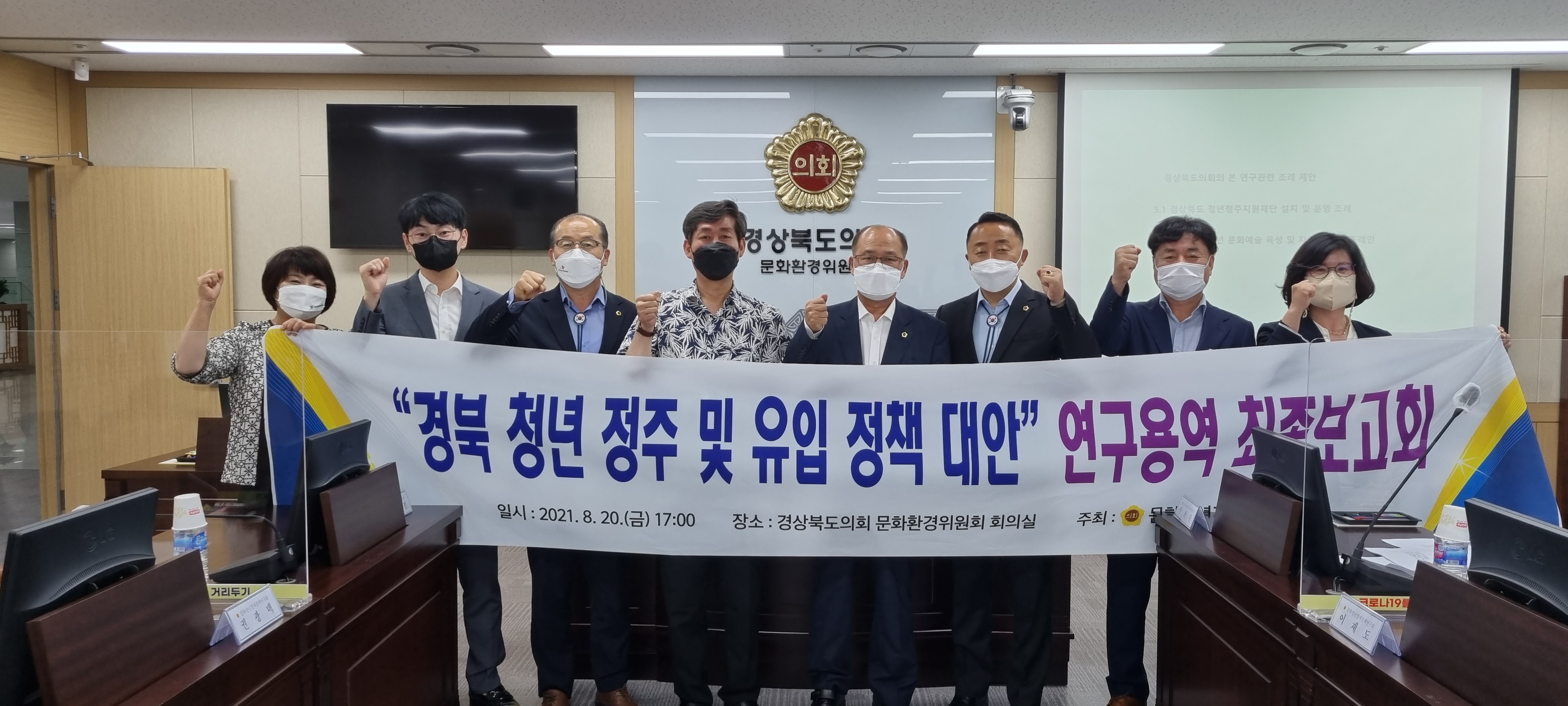 | 경북도의회 의원연구단체인 문화청년경제정책연구회(대표 박태춘 의원, 비례)는 20일 도의회 문화환경위 회의실에서 “경북 청년 정주 및 유입 정책 대안 연구용역” 최종보고회를 개최하였다.