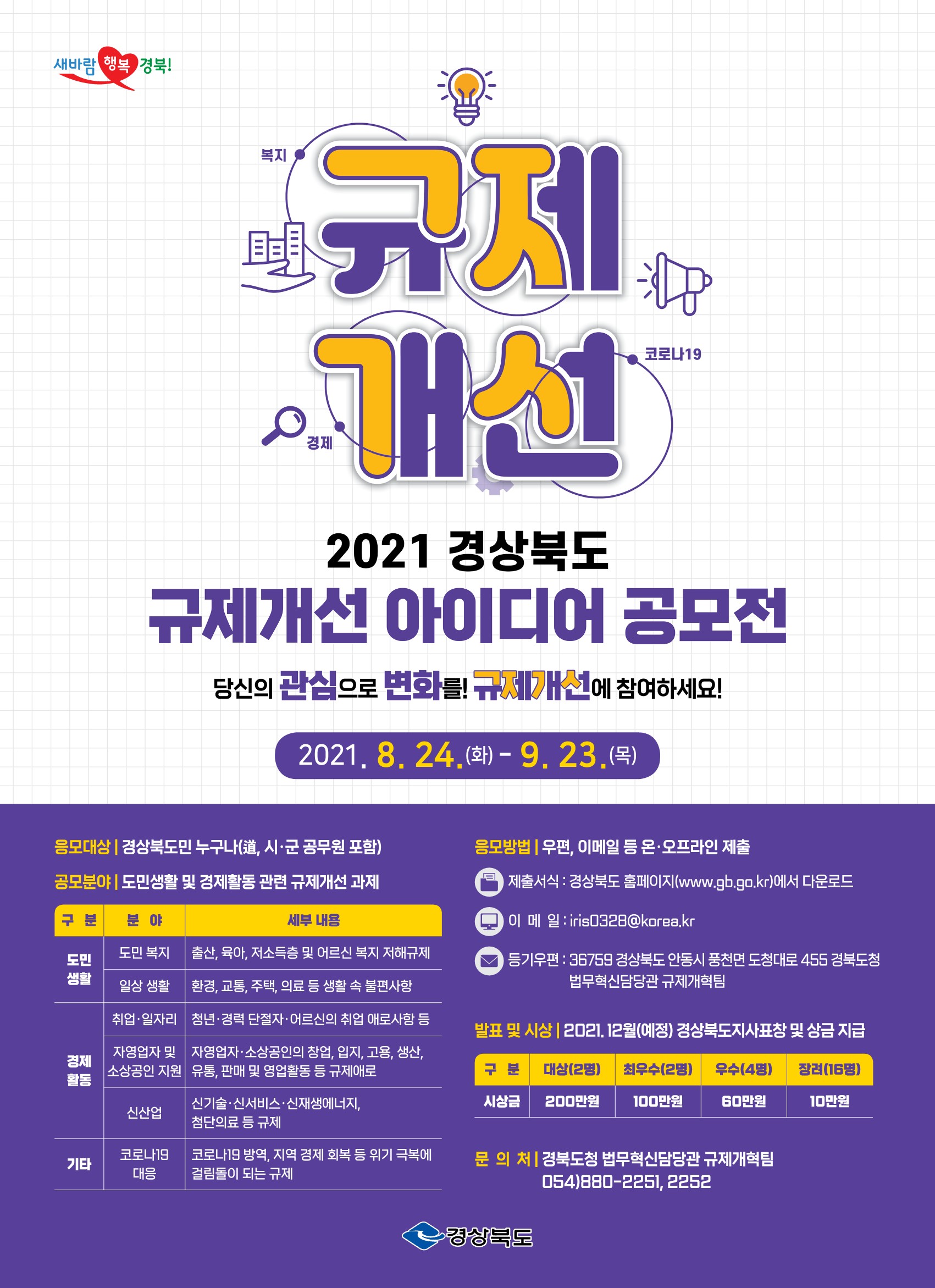 8월 24일부터 9월 23일까지 진행되는 이번 공모전은 도민이라면 누구나(공무원 포함) 참여할 수 있으며, 경상북도와 시군 홈페이지에서 공모 서식을 다운받아 이메일, 등기우편 또는 시군 규제부서를 통해 접수할 수 있다.