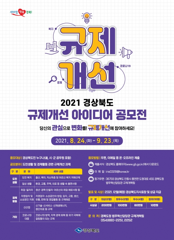 | 경상북도는 기업과 도민이 일상생활 속에서 느끼는 불편한 규제와 경제활동에 걸림돌이 되는 규제들을 효과적으로 발굴하기 위해‘2021년 규제개선 아이디어 발굴 공모전’을 실시한다고 24일 밝혔다.