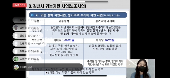 | 김천시(시장 김충섭)는 지난 24일 신규 및 예비 농업인 48명을 대상으로 제26기 영농기초 귀농교육 온라인 개강식을 가졌다.
