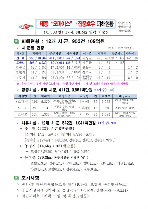 태풍 피해지역 응급복구비 30억원 긴급 지원요청