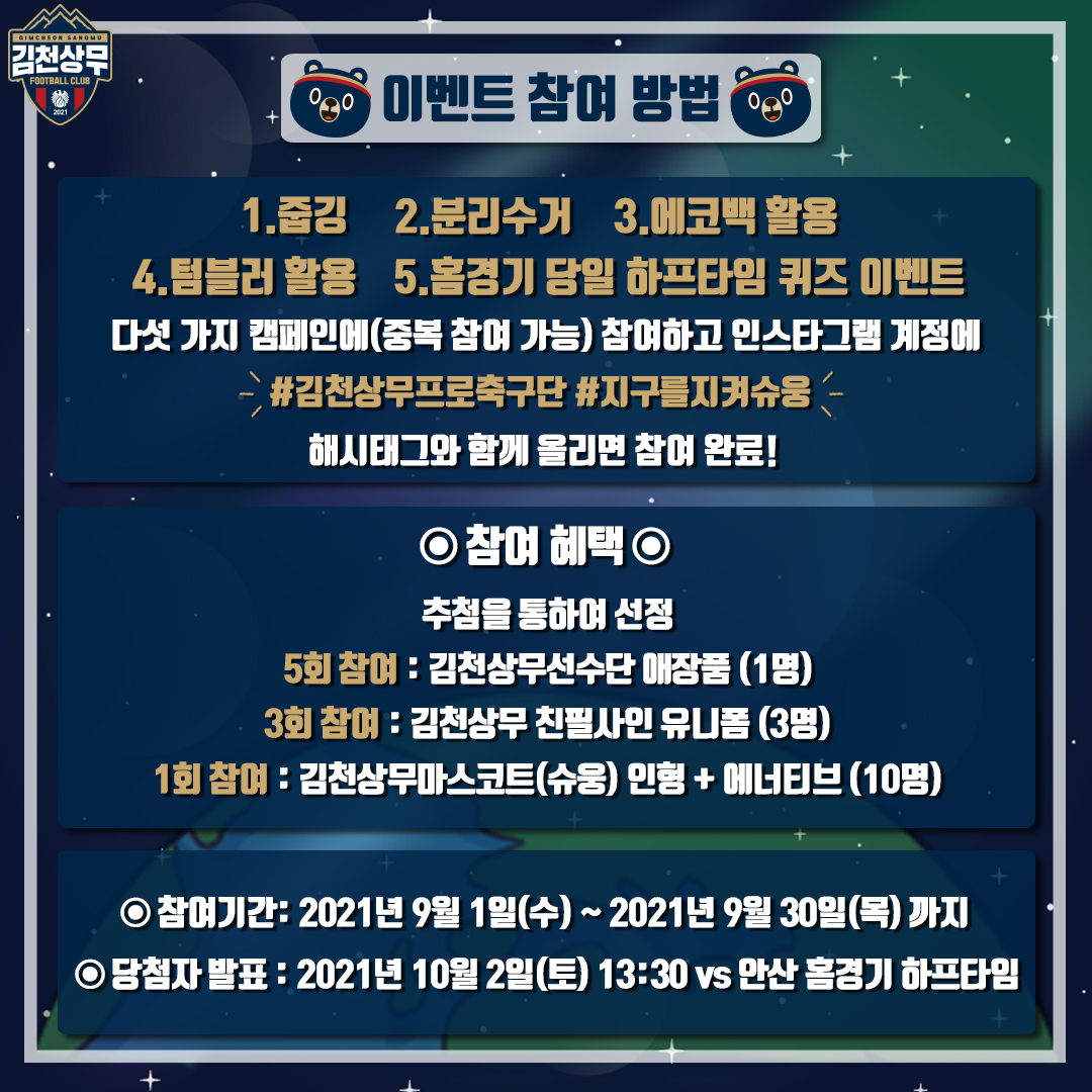 참여 기간은 9월 1일부터 30일까지며 5회 이상 인증샷 업로드 시 추첨을 통해 1명에게 김천상무 선수단 애장품을 증정한다. 3회 이상 인증 시 3명에게 친필사인 유니폼을, 1회 이상 진행 시 10명에게 슈웅 인형과 에너티브 한 박스를 제공한다. 당첨자 발표는 10월 2일 안산과 홈경기 하프타임에 진행된다.