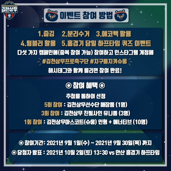 줍깅부터 분리수거, 에코백 활용, 텀블러 할용, 홈경기 당일 하프타임 퀴즈 이벤트까지 총 5가지 환경 캠페인 중 골라서 참여하면 되고 중복 참여도 가능하다. 구체적인 캠페인 동참 방법은 쓰레기 줍기, 분리수거, 일회용품 대신 에코백 활용, 종이컵 대신 텀블러 사용, 홈경기 당일 하프타임에 전광판을 통해 송출되는 환경보호 퀴즈 이벤트 화면 촬영이다. 다섯 가지 방법 중 한 가지에 동참한 뒤 인스타그램에 #김천상무프로축구단 #지구를지켜슈웅 해시태그와 함께 올리면 참여가 완료된다.
