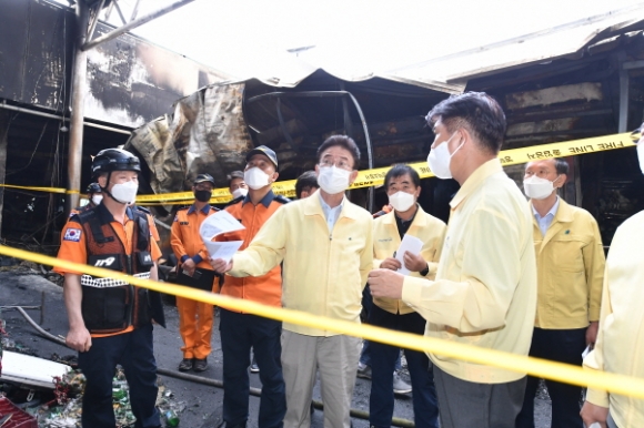 이철우 경북도지사는 긴급히 화재현장을 방문해 피해현장을 세밀히 둘러 본 후“모든 행정력을 동원해 하루 빨리 생업으로 돌아갈 수 있도록 최대한 지원하도록 할 것”이라며 피해 상인들을 위로했다. |