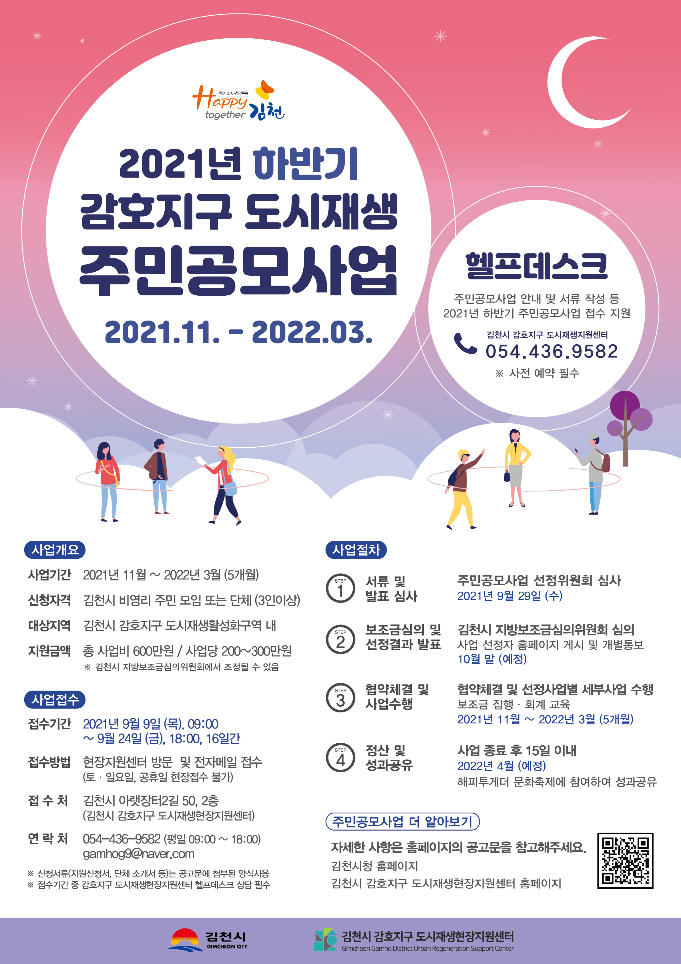 이번 공모사업의 접수 기간은 이달 24일까지이며 김천시청 및 김천시 감호지구 도시재생현장지원센터 홈페이지에서 공고와 신청양식을 확인할 수 있으며, 원활한 공모 접수를 돕기 위해 감호지구 도시재생현장지원센터에서 접수기간 내 사전 예약제로 헬프데스크를 운영할 예정이다.
