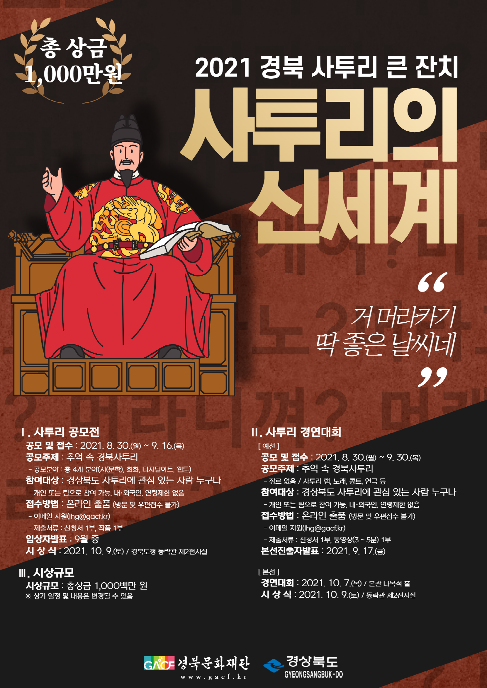경북문화재단에서 주관하는 이번 경북 사투리 큰 잔치는 사투리 공모전과 사투리 경연대회로 구성되어 있다. 사투리 공모전은 9월 16일까지 사투리와 관련된 추억이 깃든 회화, 시, 웹툰, 영상으로 참여할 수 있다.