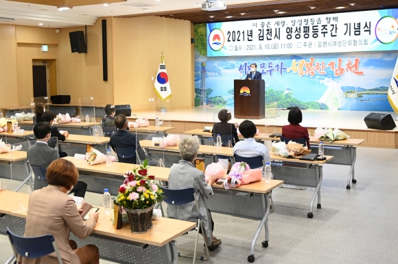| 김천시(시장 김충섭)는 9월 10일 오전 11시 시청 강당에서 ‘더 좋은 세상, 양성평등을 향해’라는 슬로건으로 2021 양성평등주간 기념식을 개최했다.