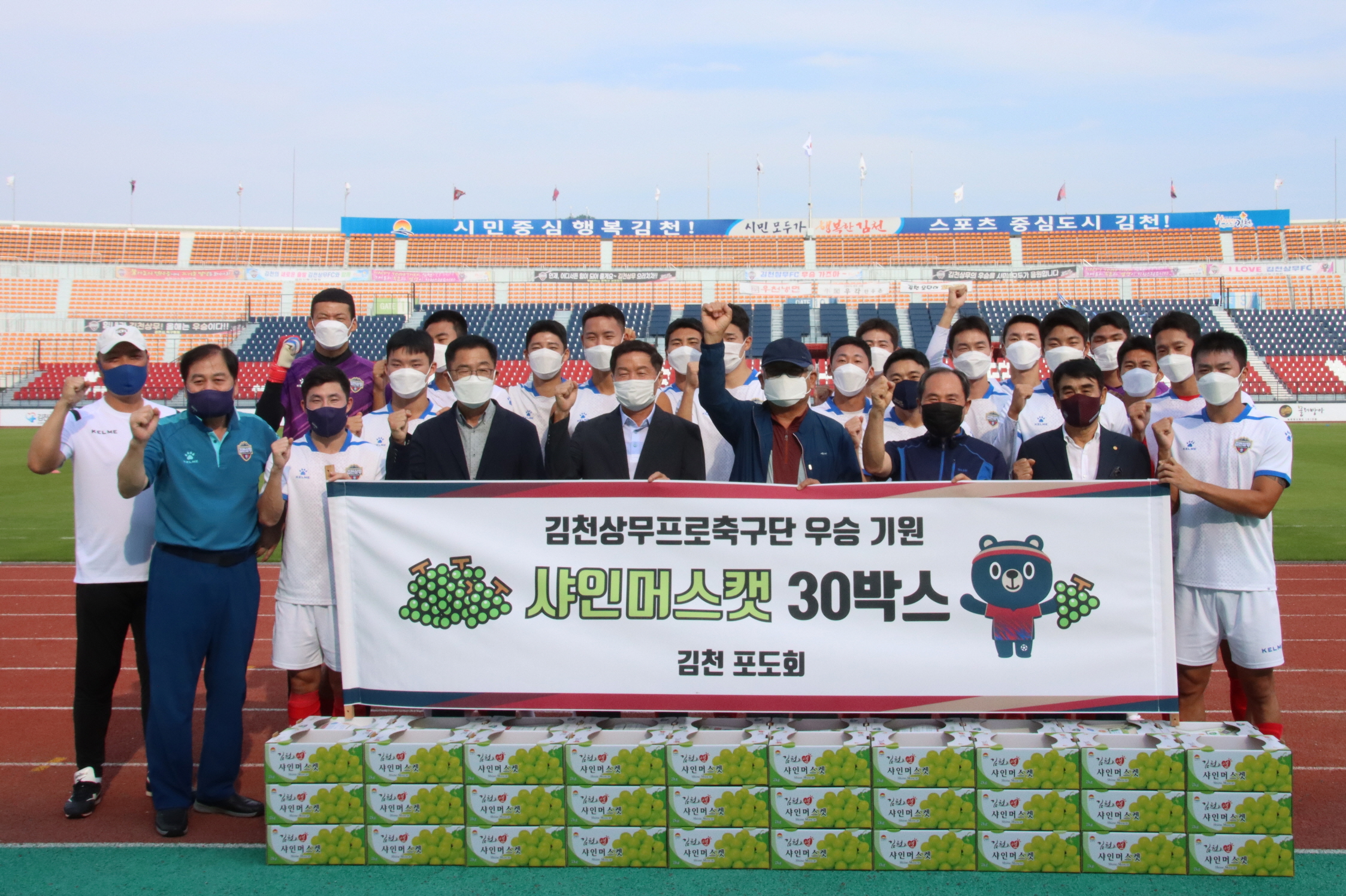 샤인머스켓의 상품화에 앞장서고 있는 김천포도회가 김천상무의 연승 및 승격을 응원하기 위해 선수단에게 샤인머스켓 30박스를 전달했다.