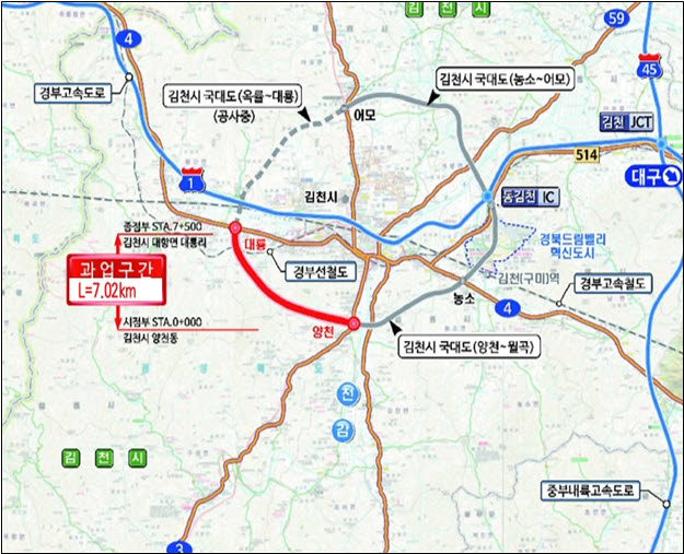 향후 시행될 김천 양천-대항간 국도대체우회도로는 총사업비 1,073억원을 투입하여 연장 7.02㎞ 4차로 전제 2차로 신설로 건설될 계획이다. |