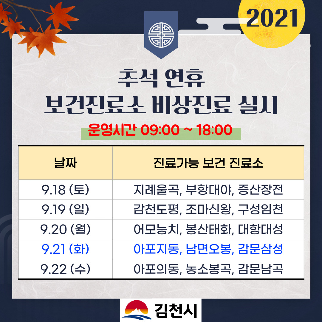 | 김천시는 추석 명절 연휴기간인 9. 18.(토) ~ 9. 22.(수)까지 응급 환자 및 일반 환자 진료 공백을 최소화하기 위해 김천시 의사회, 약사회 등과 협조하여 의료응급진료체계를 구축한다고 밝혔다.