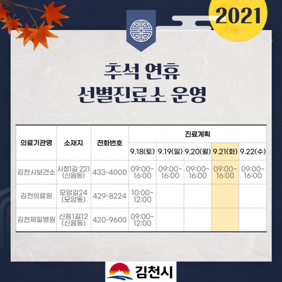 김충섭 김천시장은 “추석 연휴기간 동안 시민 의료 불편을 최소화할 수 있도록 최선을 다하겠다.”고 밝혔다.