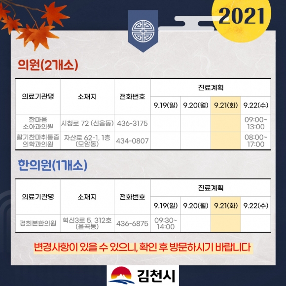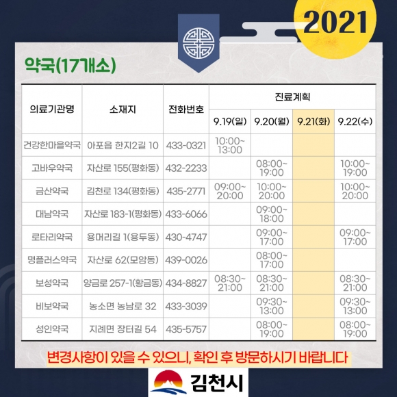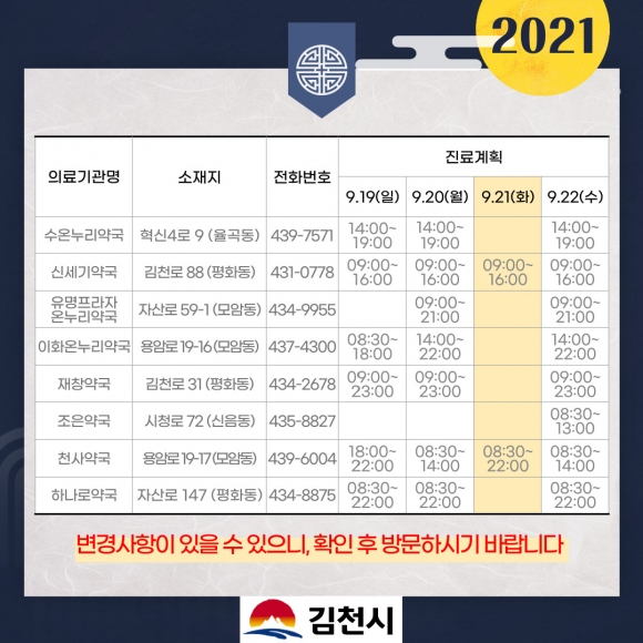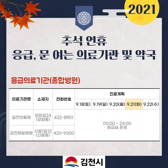 추석 연휴기간 중 문 여는 의료기관 및 약국에 대한 정보는 보건복지콜센터(129), 119구급상황관리센터(119), 경상북도 콜센터(120), 김천시보건소(433-4000)로 연락하거나 김천시청·김천시보건소 홈페이지, 응급의료포털(www.e-gen.or.kr), 스마트폰 앱(응급의료정보제공), 포털사이트에서 ‘명절 진료’로 검색하면 안내받을 수 있다.