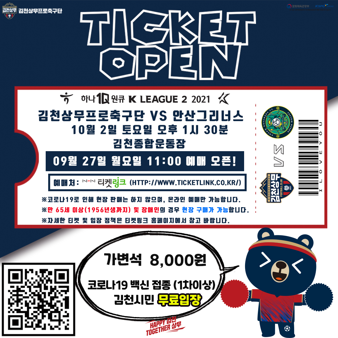 | 김천상무가 10월 2일 홈경기에서 테이블 석을 포함한 가변석 전 좌석을 8,000원에 오픈한다. 이번 홈경기에서는 가변석만 오픈하며 일반석은 휠체어 석만 운영한다.