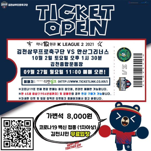 김천상무프로축구단(대표이사 배낙호)이 27일 오전 11시, 온라인 예매 사이트 티켓링크를 통해 내달 2일 오후 1시 30분 김천종합운동장에서 열리는 ‘하나원큐 K리그2 2021’ 32R 안산그리너스와 홈경기 온라인 예매를 시작한다.