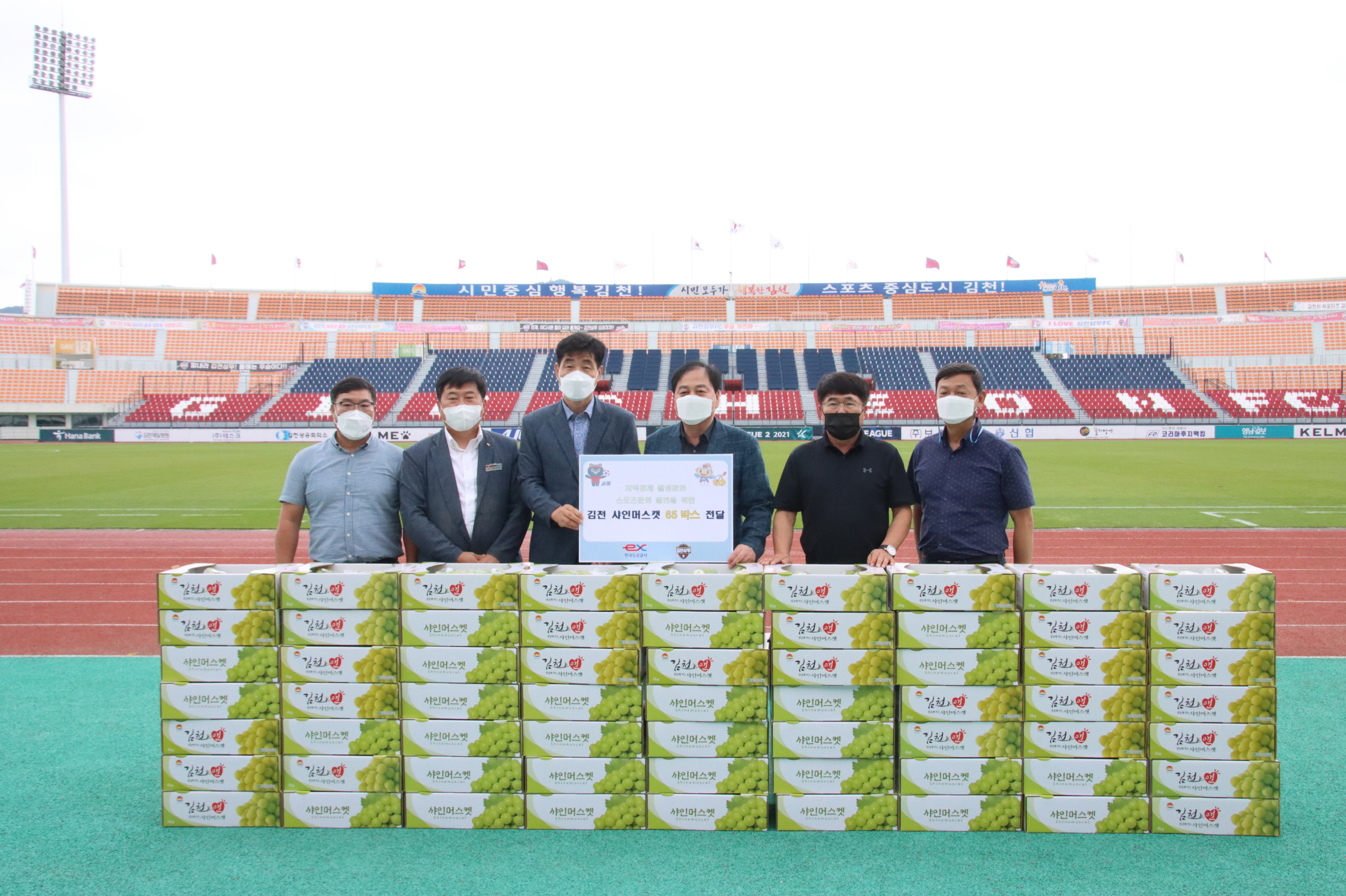| 한국도로공사가 김천상무프로축구단에 샤인머스캣 65박스를 전달했다.