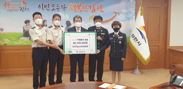 |  | | | ⓒ 김천내일신문 | | 김천소방서 의용소방대 연합회(우석수, 최옥순 남녀회장)는 지난 10월1일 김천시를 방문해 코로나19로 어려움에 처한 이웃을 돕기 위해 성금 500만원을 전달했다. 김천시 의용소방대는 코로나-19 감염방지를 위해 지역 내 복지시설 및 버스승강장 등에 방역 활동 자원봉사를 하고 있다.