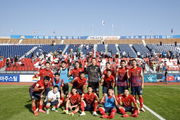 |  | | | ⓒ 김천내일신문 | | 김천상무프로축구단(대표이사 배낙호)이 지난10월2일 천종합운동장에서 열린 ‘하나원큐 K리그2 2021’ 32R 안산그리너스와 홈경기에서 후반 33분, 박동진의 득점에 힘입어 1대 0으로 승리했다.
