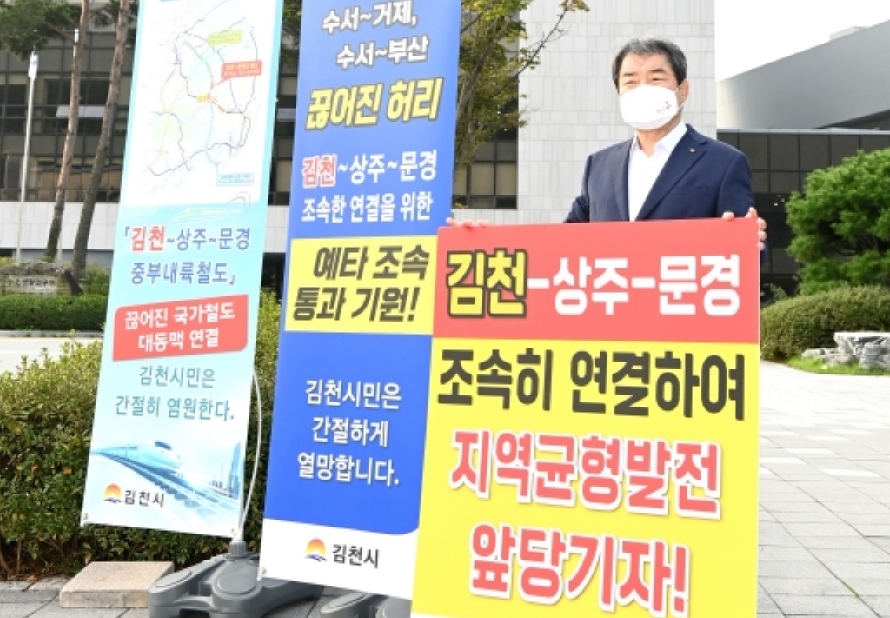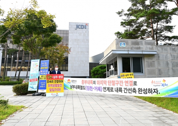 | 김충섭 김천시장은 지난 10월5일 세종시에 위치한 한국개발연구원(KDI) 전정에서 수서에서 거제 및 부산을 잇는 국가 철도망 노선 중 유일한 미개통구간인 문경 ~ 김천 구간의 철도를 연결하는 중부내륙철도의 조속한 시행을 촉구하며 1인 피켓시위에 나섰다.