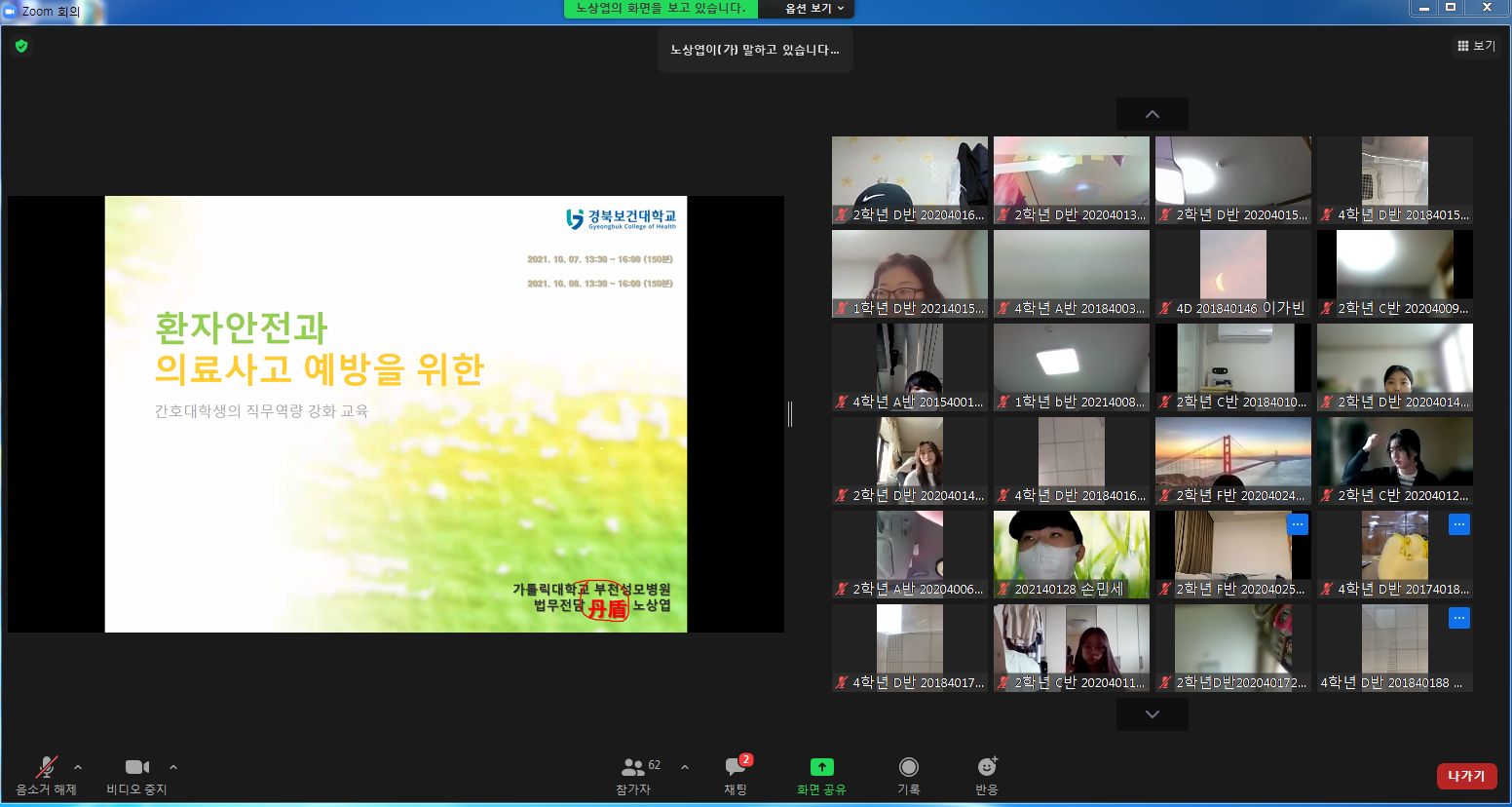 | 취업명문 경북보건대학교(총장 이은직)는 지난 10월 7일~8일 이틀에 걸쳐 Zoom 프로그램을 이용하여 2021학년도 경북보건대학교 전문대학 혁신지원 사업의 일환으로 간호학부 재학생을 위한 직무역량강화특강을 실시했다.