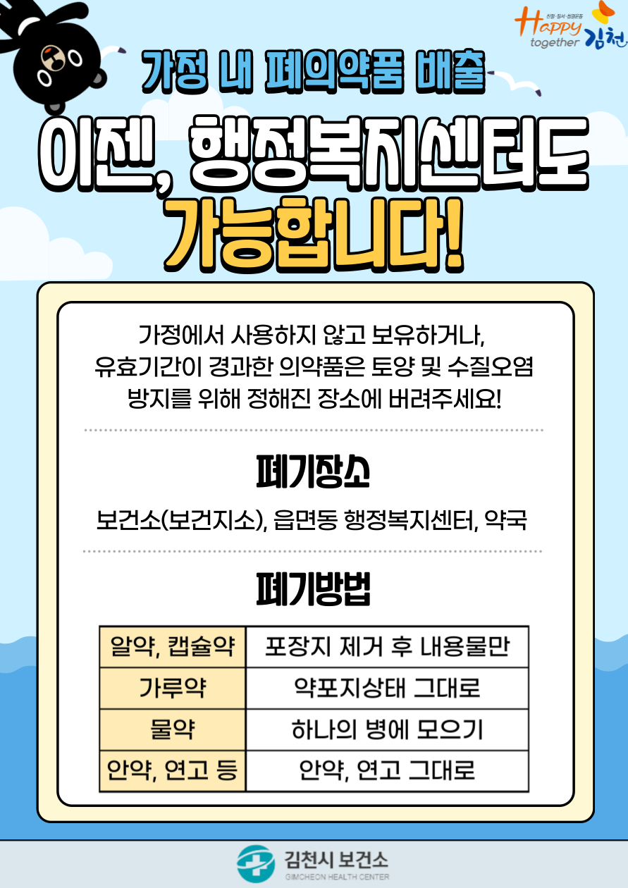 | 김천시(시장 김충섭)는 안전한 의약품 사용 환경 조성 및 환경오염 예방을 위해 폐의약품 수거함을 각 읍·면·동 행정복지센터로 설치를 확대했다.