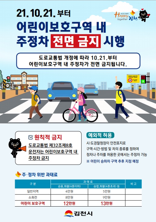 | 김천시(시장 김충섭)는 도로교통법 개정에 따라 10월 21일부터 모든 어린이보호구역 내 도로에서 차량 주․정차가 전면 금지됨에 따라 적극 홍보에 나섰다.